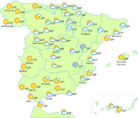 I dag står den på byger og tordenvejr, der lokalt kan være stærke på den sydøstlige del af halvøen. Stærk vind i perioder ved kysterne i Galicien, Strædet og De Kanariske Øer.