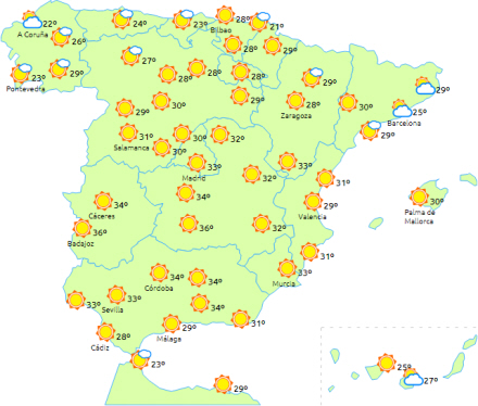 Temperaturer uden ændringer eller i let stigning, så vi ender på noget, der ligner 30 til 36 grader og 20 til 24 i nat. Let vind fra skiftende retninger og briser i højtliggende egne.