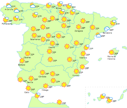 Stigende dagstemperaturer til De Kanariske Øer og den sydlige halvdel af fastlandet, mens de falder på den nordlige. Stigende nattemperaturer i næsten hele landet.