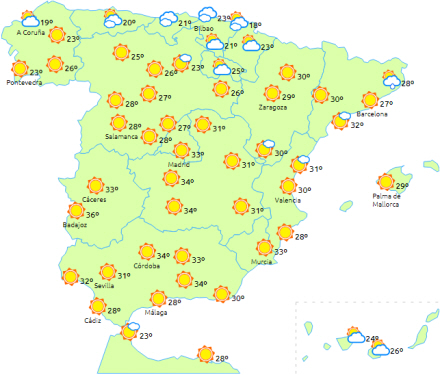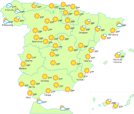 Generelt stigende dagstemperaturer undtagen i Galicien, det sydlige Andalusien og De Kanariske Øer, hvor de forbliver uændrede. Stigningen vil være lokalt særligt mærkbar i Navarra, det østlige Cantabrien, øvre Ebro-dal og Valencia.