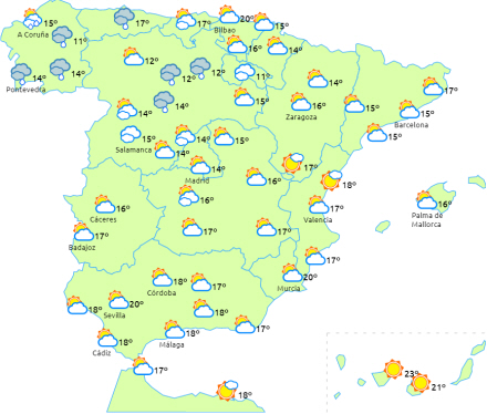 Perioder med lavthængende skyer i dagens første halvdel på resten af den østlige halvdel af halvøen, og risiko for morgentåge i halvøens indre egne samt Ebro-dalen.