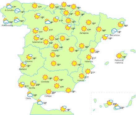 Lavthængende skyer over Cantabrien, de indre egne fra nord til syd, Catalonien og Balearerne. Skyerne kan være noget vedholdende i den nordvestlige del af Castilla y León.