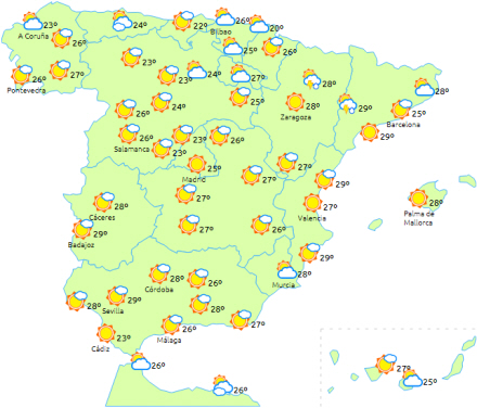 Overvejende letskyet til klar himmel over halvøen i dag, men i løbet af dagen tiltagende skydække i de indre egne, hvilket giver byger og torden i de nordvestlige, indre egne og Pyrenæerne. Nedbøren kan lokalt være tung og blive ledsaget af hagl i det nordvestlige hjørne.