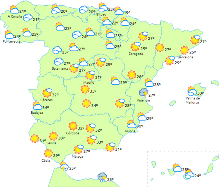 Faldende dagstemperaturer i Middelhavsområdet og særligt den helt sydlige spids af halvøen, få ændringer eller let fald på De Kanariske Øer og stigninger i resten.