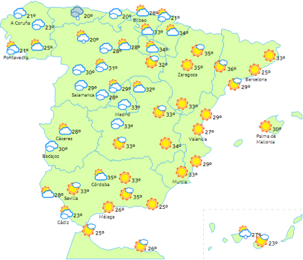 Skyet eller overskyet med sandsynlighed for nedbør i Galicien, det vestlige Cantabrien og det nordvestlige Castilla y León, der kan blive ledsaget af lejlighedsvise tordenbyger, og det kan blive lokalt stærk nedbør i Asturien og det nordlige León.