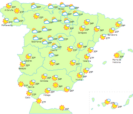 Skyet til overskyet med mellemrum med mellem- og højtliggende skyer i resten af Biscay-bugten og Castilla y León, de indre egne og det nordvestlige Extremadura.