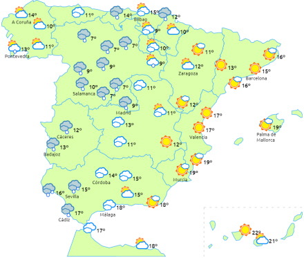 Faldende temperaturer undtagen i Middelhavsområdet, hvor dagstemperaturerne stiger lidt og et let fald på De Kanariske Øer. Frost i Pyrenæerne og højtliggende områder i de cantabriske bjerge og centrale og iberiske bjerge.