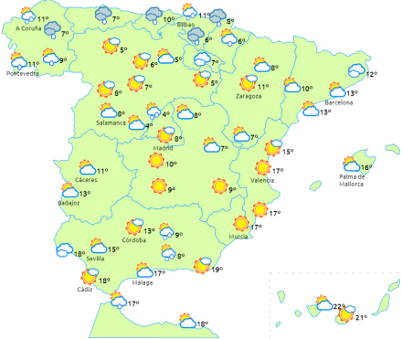 Faldende dagstemperaturer på halvøen og De Baleariske Øer og kun få ændringer på De Kanariske Øer. Frost i bjergområder i den nordlige halvdel og sydøst af halvøen.