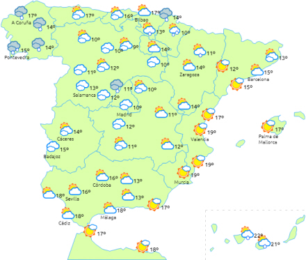 Generelt overskyet over den nordvestlige del af halvøen, øvre Ebro og Pyrenæerne med noget svagt nedbør, der har tendens til at aftage i løbet af dagen undtagen i Galicien, hvor de vil være mere intense og lokalt vedholdende i vest.