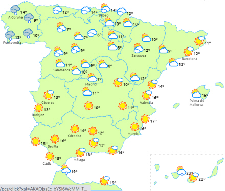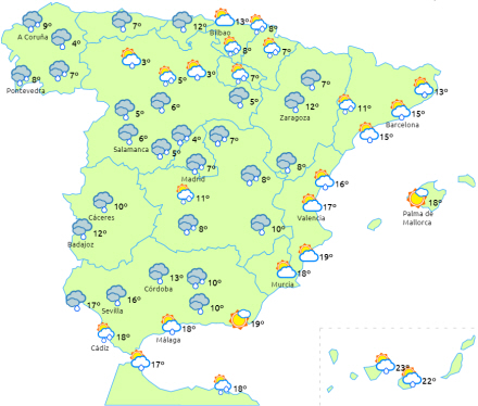 Lokalt tunge byger på øen La Palma, mens der varsles snefald i slutningen af dagen i de cantabriske bjerge og Pyrenæerne. Stiv kuling i perioder langs den galiciske og cantabriske kystlinje.