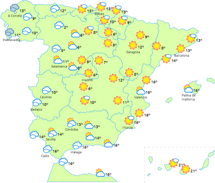 Faldende dagstemperaturer i den vestlige del af halvøen og stigende i nordøst og på De Baleariske Øer. Nattemperaturerne stiger i den vestlige del af halvøen og på Pyrenæerne og falder i Ebro-dalen. Fortsat frost i de indre egne, bjergene og i det indre af Andalusiens østlige egne og den nordøstlige del af halvøen.