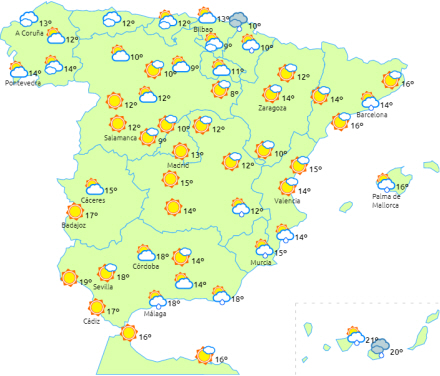Stigende dagstemperaturer i de indre, sydøstlige egne af halvøen, mens de er faldende på den nordvestlige halvdel og med få ændringer i resten. Svag frost i bjergene i den nordlige og sydøstlige halvdel - koldest i Pyrenæerne.