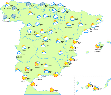 Store dele af landet vil i dag kunne nyde en letskyet himmel eller måske med højtliggende skyer. Imidlertid forventes en knapt så aktiv front at trække ind nordvestfra over halvøen, og det giver skyet eller overskyet himmel over den nordvestlige tredjedel og nedbør i Galicien og langs nordvestkysten, dog generelt svagt.