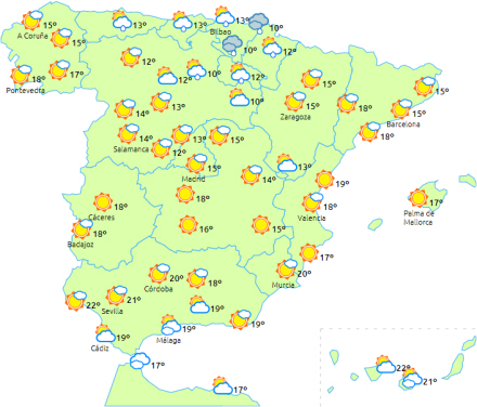 Overskyet i perioder i starten af dagen i resten af den helt nordlige del af halvøen, i De Iberiske Bjerge, Strædet, Melilla og måske et par svage byger langs den catalanske kyst og på De Baleariske øer, men efterhånden tendens til letskyet i løbet af dagen i alle disse områder. ‘