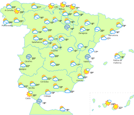 Faldende dagstemperaturer til halvøens nordlige- og indre egne i syd, men særligt mærkbart i nordvest og den øvre Ebro-dal. Vi har det varmere end normalt på De Kanariske Øer.