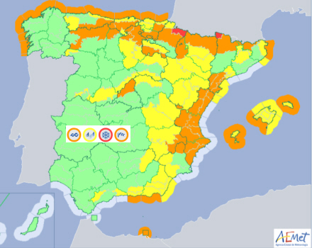 Der advares også om stærk vind på en god del af halvøen, De Baleariske Øer, Ceuta og Melilla og meget stærke vindstød i bjerg- og kystområder.