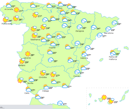 Stigende dagstemperaturer til de indre egne i nord og De Kanariske Øer. Nætterne bliver også lunere på halvøen og kommer igen op på normalniveauet for årstiden undtagen i Middelhavsområdet og det vestlige Andalusien, hvor de næppe ændrer sig meget. Vi overstiger 32 grader i dalene Tagus, Guadiana og Guadalquivir.