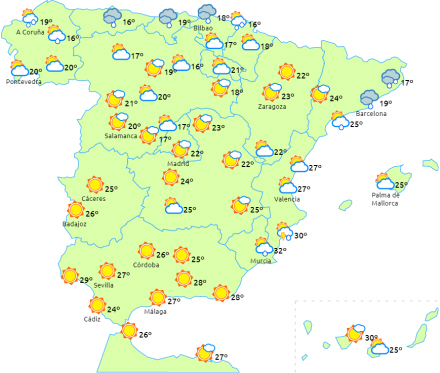 Efterhånden mere uklart i den nordøstlige del af halvøen med byger og torden i Huesca, Catalonien og de østlige af De Iberiske Randbjerge, der i anden halvdel af dagen tager til i styrke og kan blive ledsaget af hagl og lokalt blive meget kraftigt.