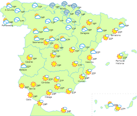Lokalt stærk eller vedvarende nedbør i Cantabrien, Navarra og Pyrenæerne, mens der varsles hård vind med meget kraftige vindstød i den nordøstlige tredjedel af halvøen og på De Baleariske Øer.
