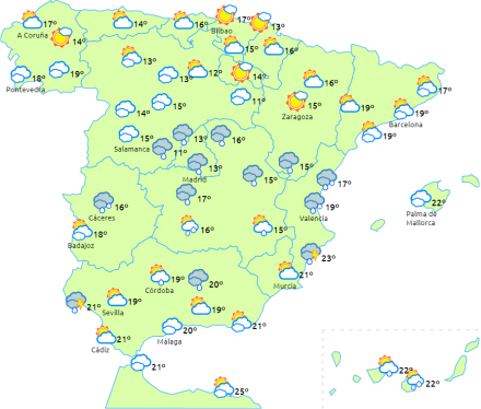 Stigende dagtemperaturer på halvøen og De Baleariske Øer, bemærkelsesværdigt i de indre egne af den nordlige halvdel. På De Kanariske Øer falder de lidt - særligt på de vestlige øer. Nætterne bliver lidt lunere i Atlanterhavsområderne og ellers ikke de store forandringer.