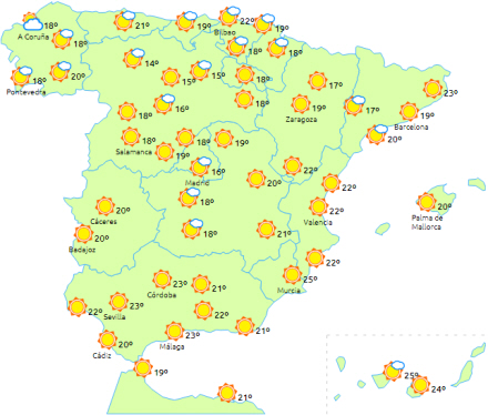Minimumstemperaturer med få ændringer og maksimum- i stigning undtagen i kystområderne, hvor de ikke ændrer sig meget. Det betyder 21 til 24 grader og ni til 12 i nat. Let vind fra skiftende retninger.