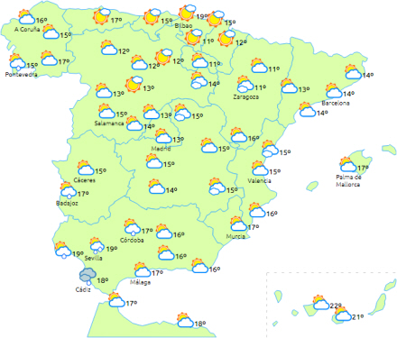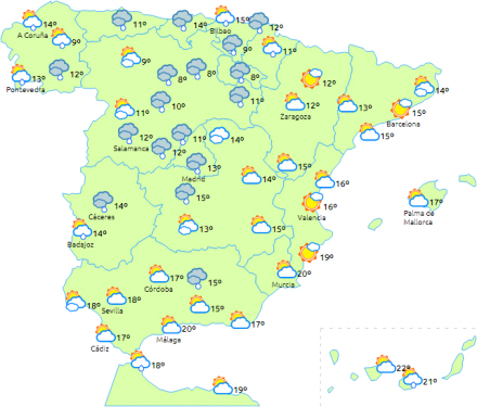 Overskyet i perioder, men efterhånden overskyet i Galicien med regn især i dagens anden halvdel og i vest. Der kan dog også efterhånden komme lidt svage dryp i resten af Galicien og det vestlige Asturien.