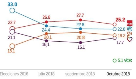Dårlige sager og vanskeligheder i forhandlingerne om statsbudgettet, har påvirket vælgernes mening. Og selvom PSOE fortsat er det største parti ved den seneste meningsmåling, begynder den negative tendens at markeres.