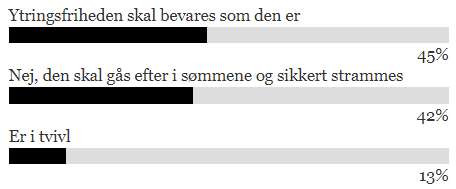 Med 45 procent til dem, der ønsker at bevare ytringsfriheden, 42 procent til dem, der synes den skal gåes efter i sømmene og sikkert strammes og 13 procent til dem, der er i tvivl. er der jo stort set tale om dødt løb.