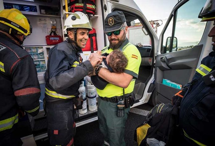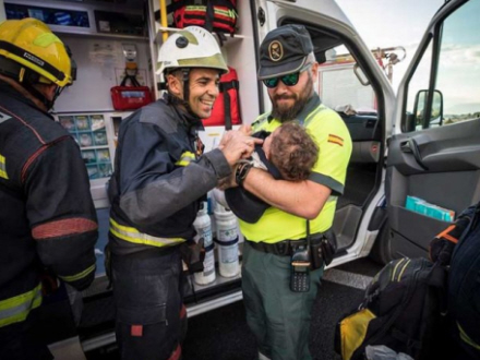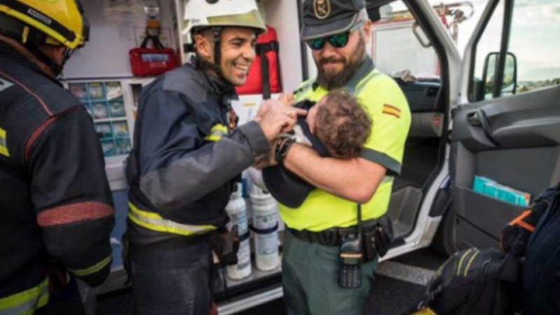 Et billede af en storsmilende brandmand og en Guardia Civil-betjent med et barn, de netop har reddet fra en trafikulykke, blev delt på brandvæsenets Twitter-profil, og responsen har været overvældende.