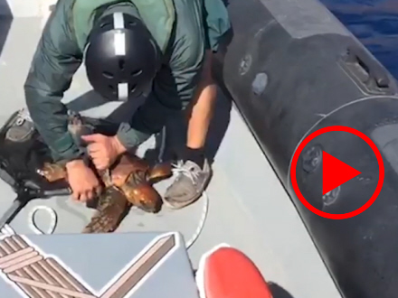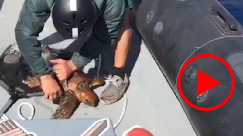 VIDEO: Havskildpadde var havnet i en uoverskuelig situation, men heldigvis kom en Guardia Civil-båd forbi.