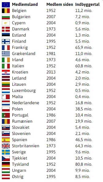 Lad os slutte med et overblik over de nuværende EU-lande, hvornår de blev optaget og hvor store befolkningerne er i de enkelte lande: