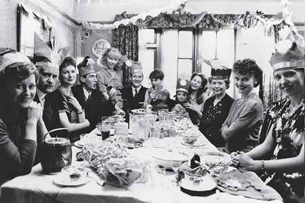 Nytårstorsken er blevet serveret på det veldækkede bord med serpentiner, truthorn og knallerter. Lunten på den første bordbombe er blevet tændt. Gæsterne sidder med festlige hatte og nogle endda med røde klovnenæser.