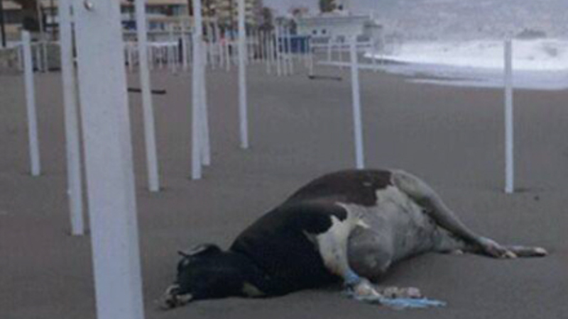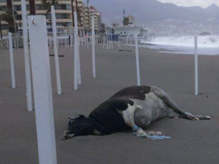 Fredag blev der dog gjort store øjne, da en død ko lå skyllet op på stranden midt i dansker-favoritten Fuengirola.
