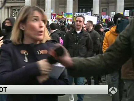 Sascot formåede på imponerende vis at fortsætte sin dækning af begivenheden på Place de la Bourse; hun hev mikrofonen tilbage fra en af mændene, mens en anden kvinde prøvede at få dem væk.