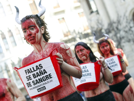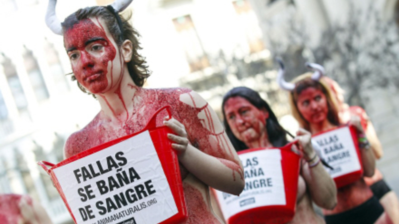 “Fallas er badet i blod” stod der på de spande, aktivisterne havde fyldt med “blod”.
