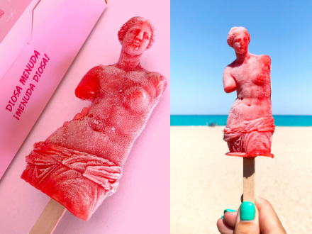 "La Venuseta er en gudinde uden arme, som mangler et bryst og er klar til at blive spist. 100 procent naturlig og meget forfriskende", lyder det fra skaberne af sodavandsisen, der smager af jordbær, kandiseret ingefær og citron.