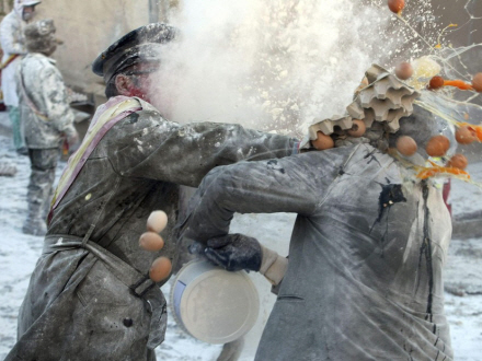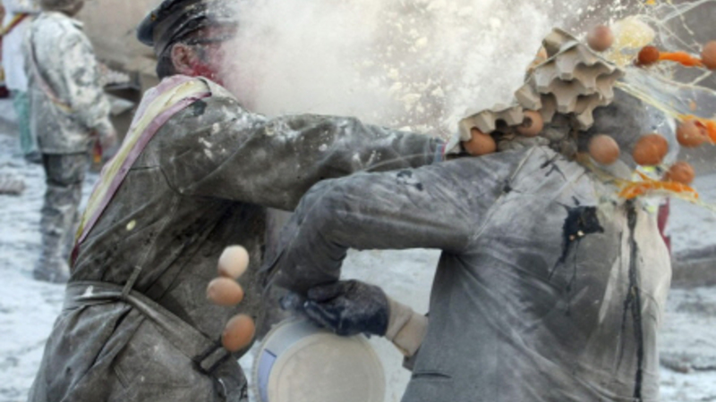 VIDEO: Hvis du befinder dig i by nær Alicante i dag, skal du passe alvorligt på, at du ikke bliver fanget i en krydsild af mel og æg.