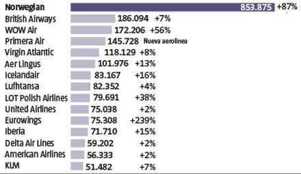 Til sammenligning har IAG-gruppens selskaber 186.000 sæder, en stigning på seks procent, mens Lufthansa stiger med fire procent til 82.300 sæder.