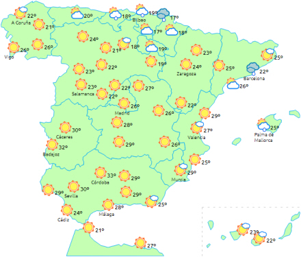 Diset ved Middelhavskysten og mulighed for lidt morgentåge-banker i Galicien, det nordlige Atlanterhavs-område og lokalt i den indre, østlige del af halvøen.