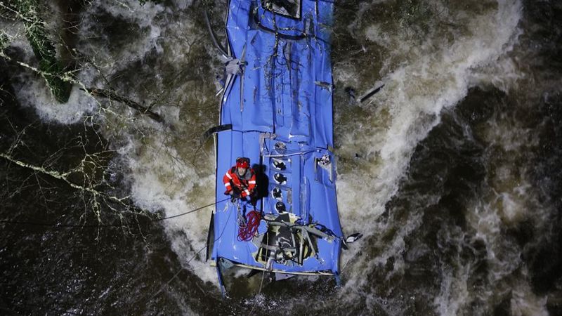 Kong Felipe havde kun lige afsluttet sin juletale, da en bus kørte gennem rækværket på en bro og styrtede 30 meter ned i floden Río Lérez.