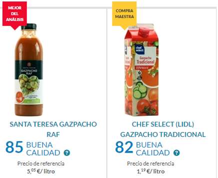OCU har analysret 41 forskelle gazpachoer, der købes på køl, som er blevet vurderet af et eksperthold. De har konkluderet, at der findes mærkevarer i supermarkederne til under 1,50 euro pr. liter med en meget god ernæringsprofil uden tilsætningsstoffer, og som også har en høj smagsmæssig kvalitet.