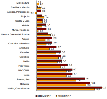 De regioner har oplevet stigninger i tredje kvartal. De største stigninger er registreret på Mallorca og de andre Balearer, Murcia og Madrid med stigninger på henholdsvis 1,7, 1,5 og 1,4 procentpoint.