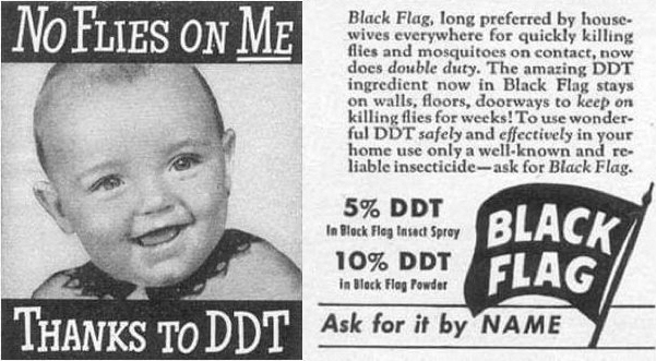 DDT blev brugt i store mængder i perioden fra 1940’erne til 1960’erne, hvor det hjalp mod både malaria og tyfus, men også mod mere hjemmelige sager som hovedlus og fluer. I amerikanske reklamer sprøjtede husmoderen lykkeligt køkkenskabet (og sin baby!) med DDT, mens hun sang af hjertens glæde: DDT is good for meeeeee!
