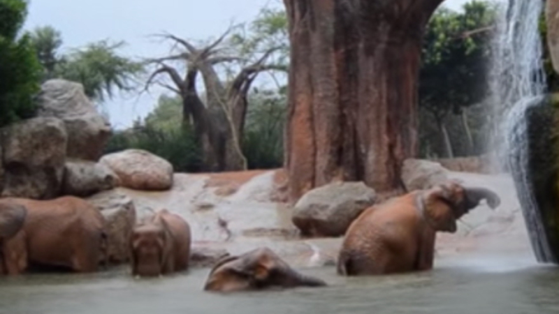 I stedet for at søge i dækning brugte Bioparc Valencias elefantfamilie det våde vejr til pjat og leg i “privat-poolen”.