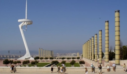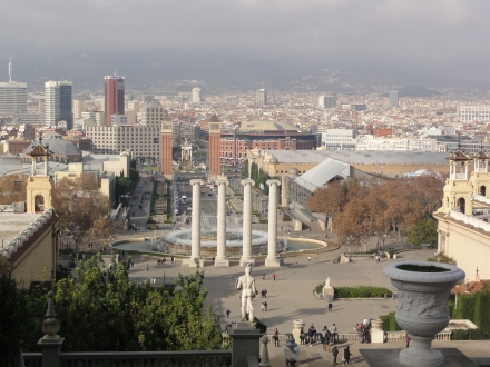 Udsigten over Plaça d'Espanya, Fira de Barcelona og kunstmuset på Montjuïc. I baggrunden til højre ses den kommunikationsmast, som blev opført i forbindelse med de olymliske lege.