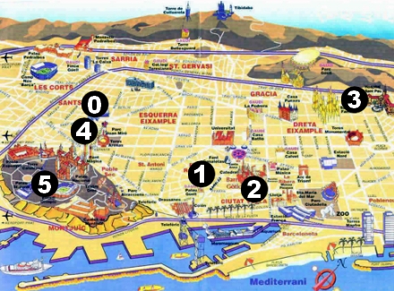 0: AVE-station Sants, 1: Rambla/hotel/ferskvaremarked, 2: Gamle bydel/julemarked, 3: La Sagrada Familia/Lars Physant atelier, 4: Arenas/Fira, 5: Kunstmuseum/olympisk by