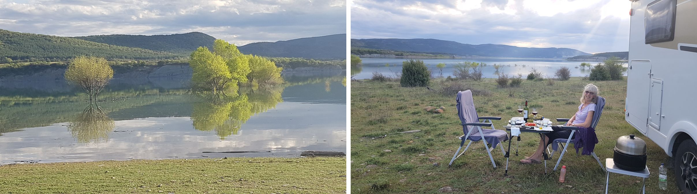 Vandet må være steget for ikke så længe siden, træer og buske står i fuldt flor ude i vandet. Vi tager aftensmaden her og nyder det gode vejr. Men da der ikke må overnattes omkring søen, finder vi en parkering nær Berdun for natten.