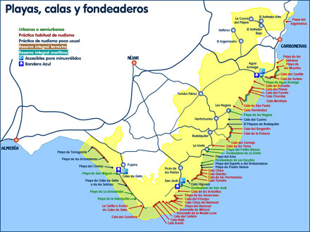 Hvis man har lyst til at tage på stranden, skal man altid se efter, hvad vej vinden blæser! Hvis vinden kommer fra vest skal man vælge strandene med omhu. Vælg en østlig strand, hvis vinden kommer fra vest og en vestlig, hvis vinden kommer fra øst, for i Cabo de Gata blæser det altid. Og glem ikke vandresko - der er klipper - og snorkel!