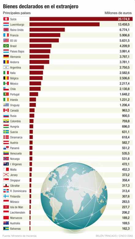 Det undrer næppe, at Schweiz ligger i toppen med omkring 20 milliarder euro, efterfulgt af Luxembourg med godt 13 milliarder euro.