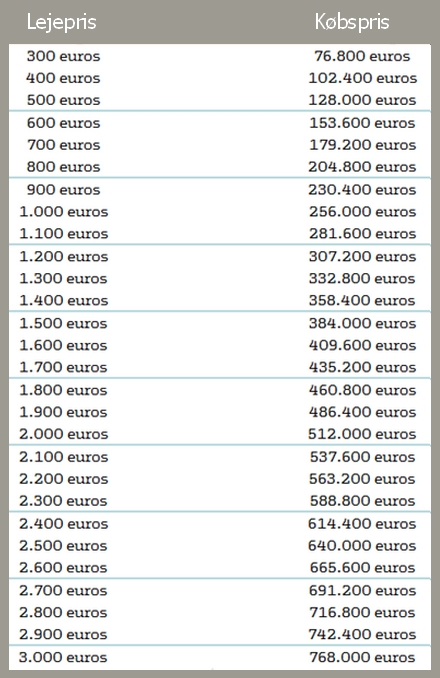 Er prisen på lejligheden eksempelvis 128.000 euro, lejen er 400 euro og fristen som nævnt to år, kan du altså efter to års leje trække 9.600 euro (24X400) fra købsprisen.